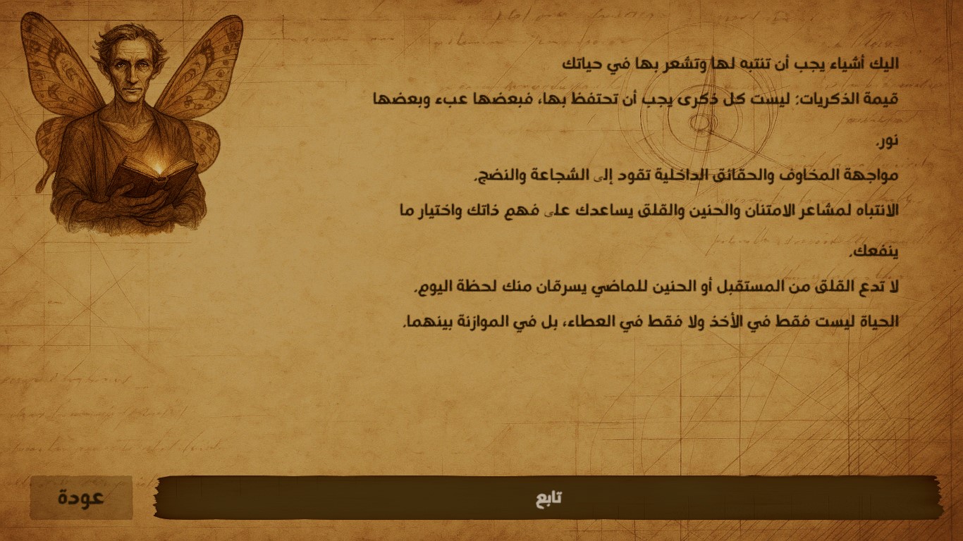 ريف – حافظ الأسرار: شاب هادئ يحمل قلادة بمفتاح يضيء عند كشف سر جديد، يختبر صدق اللاعب مع ذاته ويكشف ثقل الأسرار.