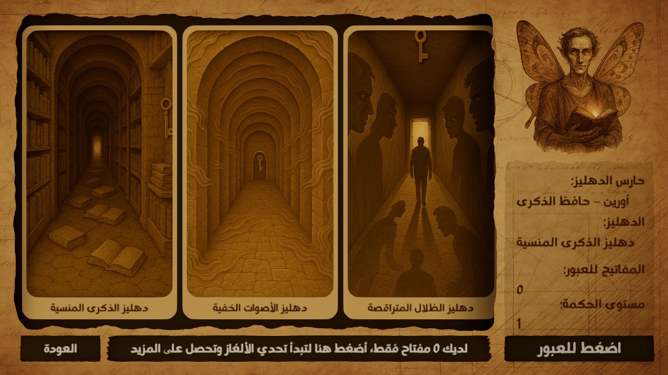 لعبور الدهاليز، يحتاج اللاعب إلى جمع عدد محدد من المفاتيح يختلف من دهليز لآخر. يحصل اللاعب على هذه المفاتيح من خلال حل الألغاز والفوازير في القسم المخصص لذلك. كلما حل اللاعب الألغاز بنجاح، يحصل على مفاتيح جديده تتيح له التقدم وفتح المزيد من الدهاليز واستكشاف تحديات جديدة. تتطلب بعض الدهاليز مفاتيح أكثر من غيرها، مما يدفع اللاعب للتركيز وحل المزيد من الفوازير قبل أن يتمكن من مواصلة رحلته.
